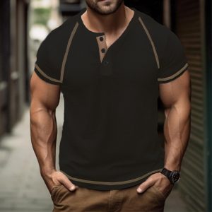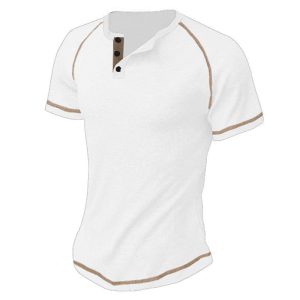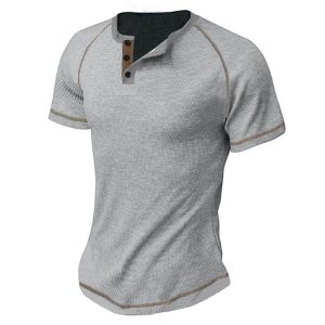 Cross-border plus size European and American round neck buckle men’s summer solid color oversized heavy waffle casual Henry T